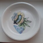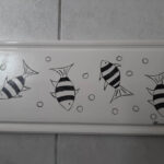 Tovaglia in fiandra 150 cm × 150 cm. Decorata con manta e pesciolini. Colori per stoffa lavabili fino a 90 gradi