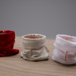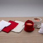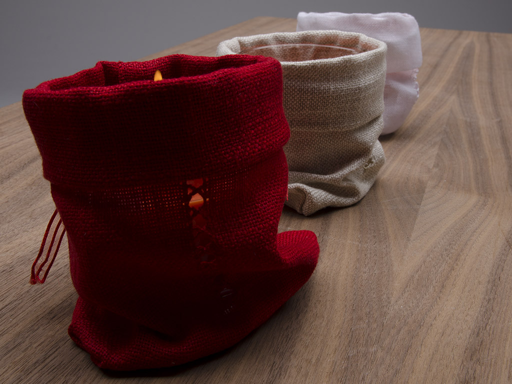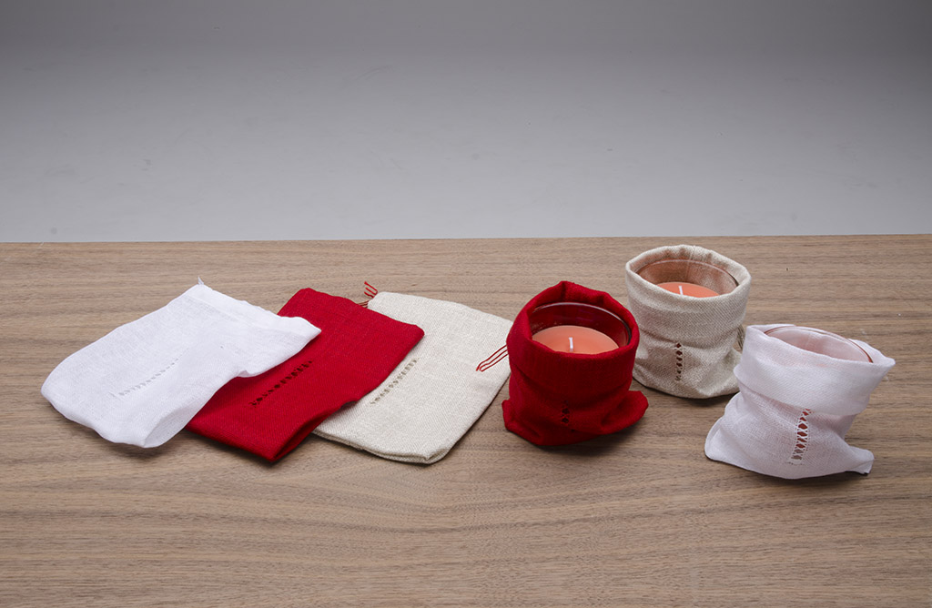 Sacchetti in lino riutilizzabili con bicchiere in vetro contenente candela profumata
